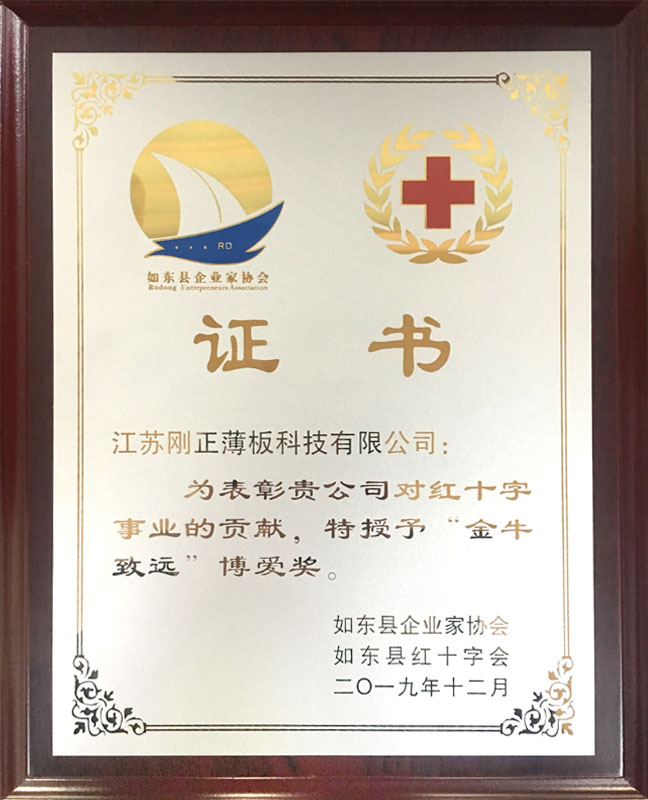 2020年1月14日,如東縣企業(yè)家協(xié)會、如東縣紅十字會共同授予江蘇剛正薄板科技有限公司“金牛致遠(yuǎn)博愛獎”。